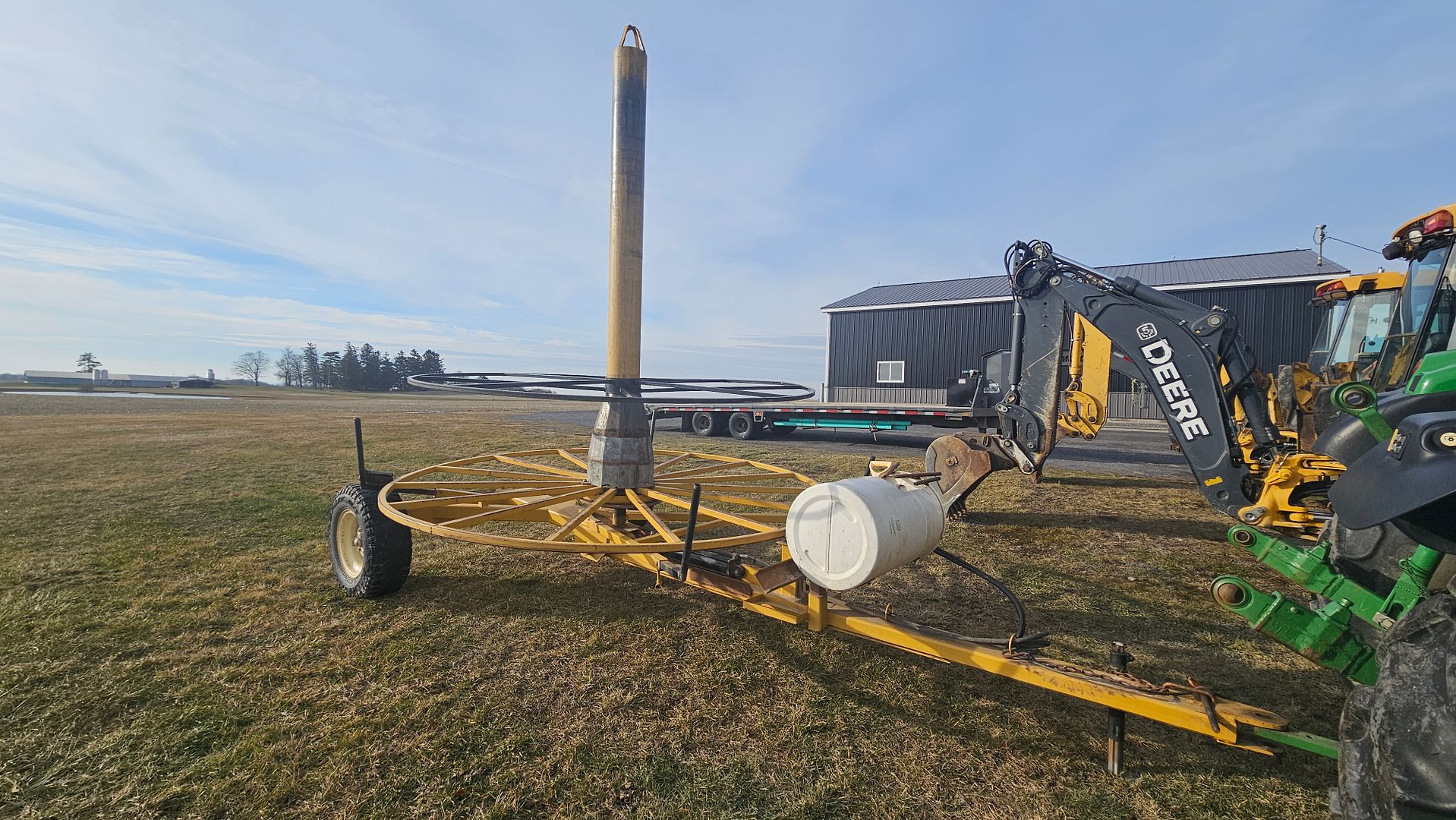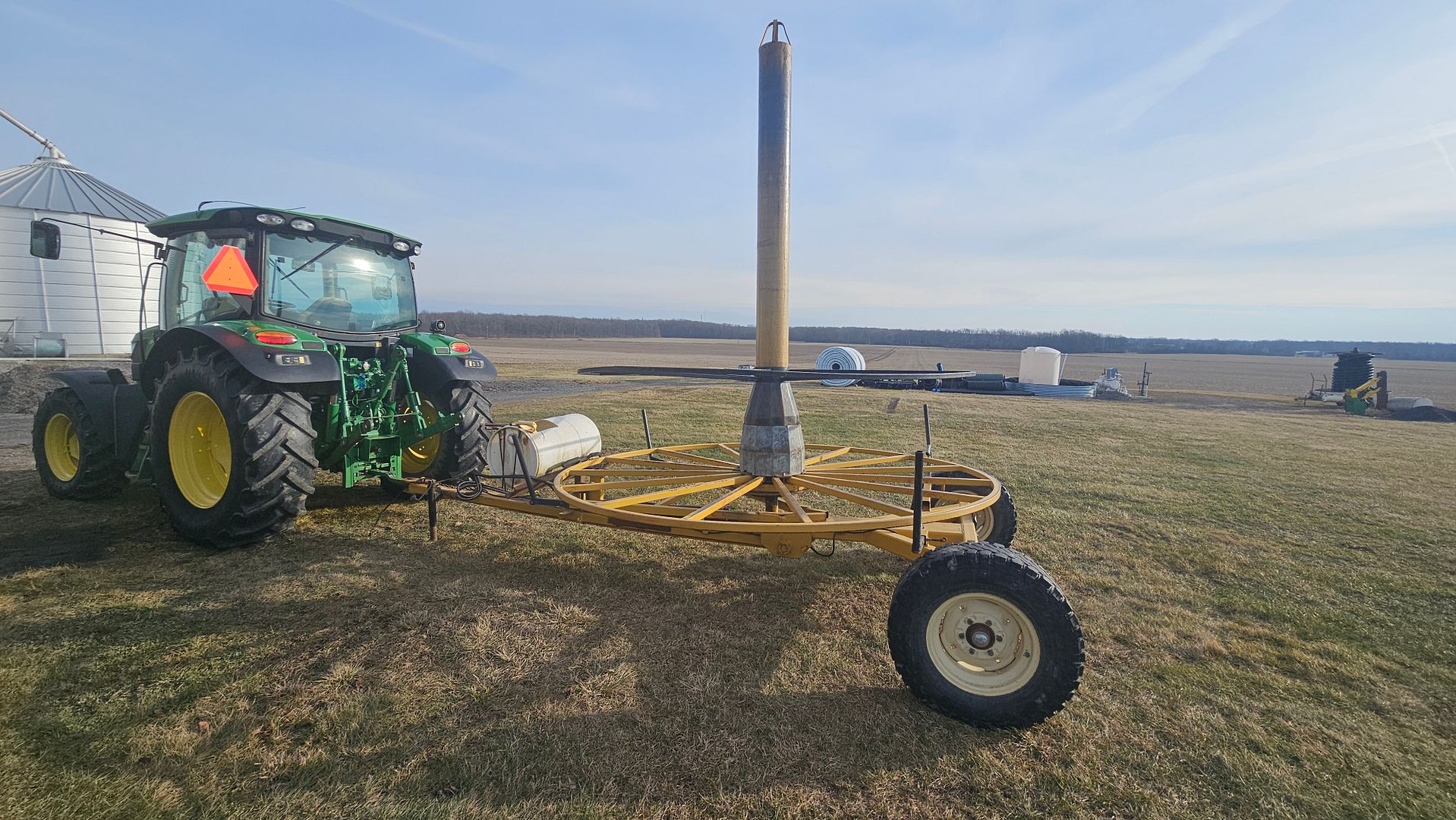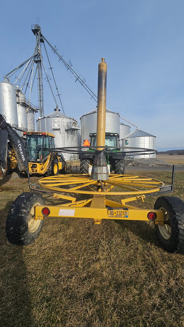 Although we cannot remember when this tile cart was originally purchased, it is still in very good condition. It has been customized over the years to suit our use. Custom centering cones for rolls with both 15″ & 18″ tile cores were built to keep the maxi coils centered on the cart while on side hills. The addition of the plastic drum on the front for carrying fittings was a must. The bracket for the single drum was built to support two drums if the need was there for another.